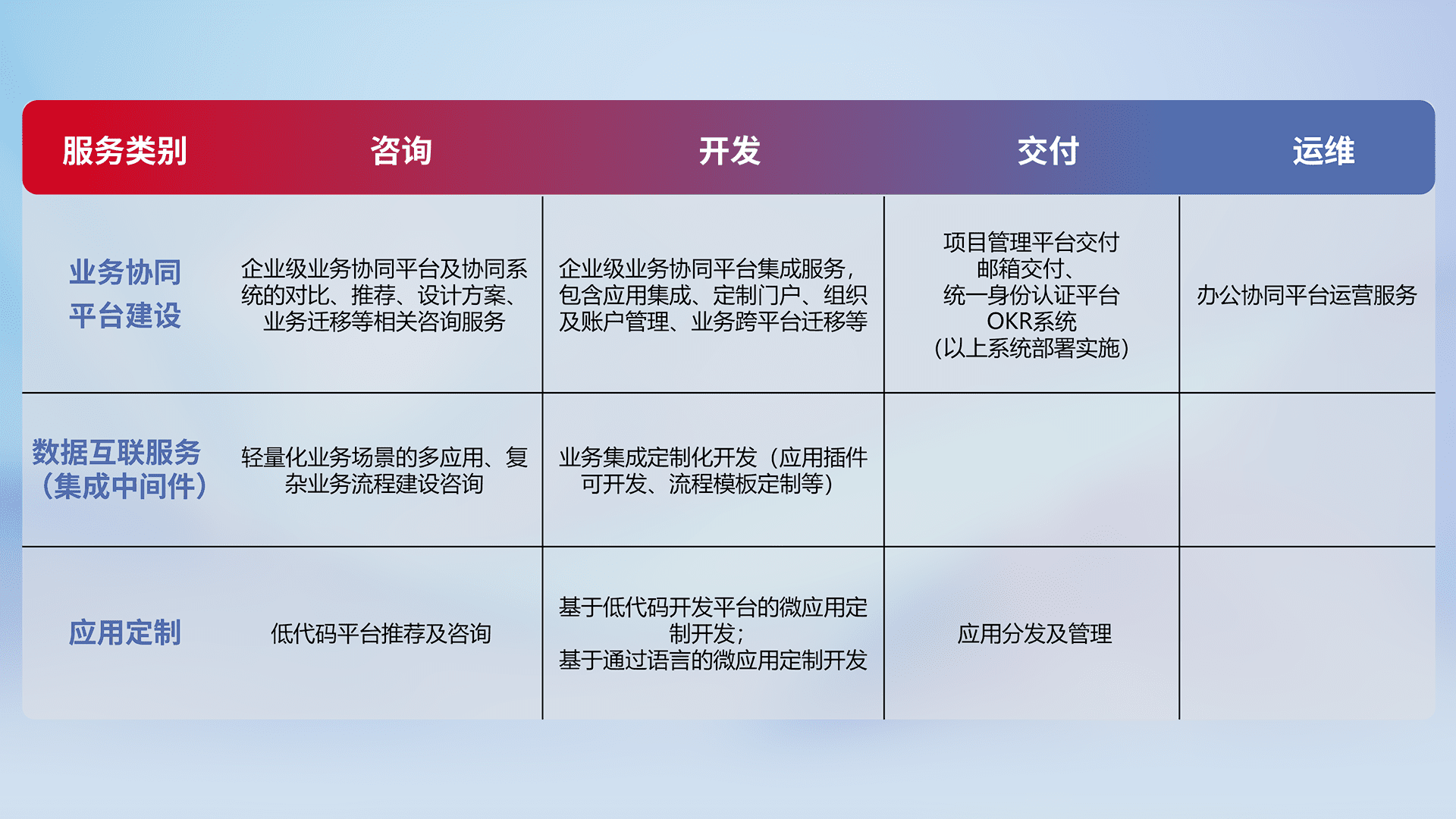 针对钉钉、、、企微、、、、IDaas等平台级产品提供产品的规划、、、、方案、、、、交付、、、定制化开发等服务,,,实现如统一协同办公、、智能客户服务、、、混合会议管理、、、、智能数据查询、、、、等业务场景,,实现数字化转型。。